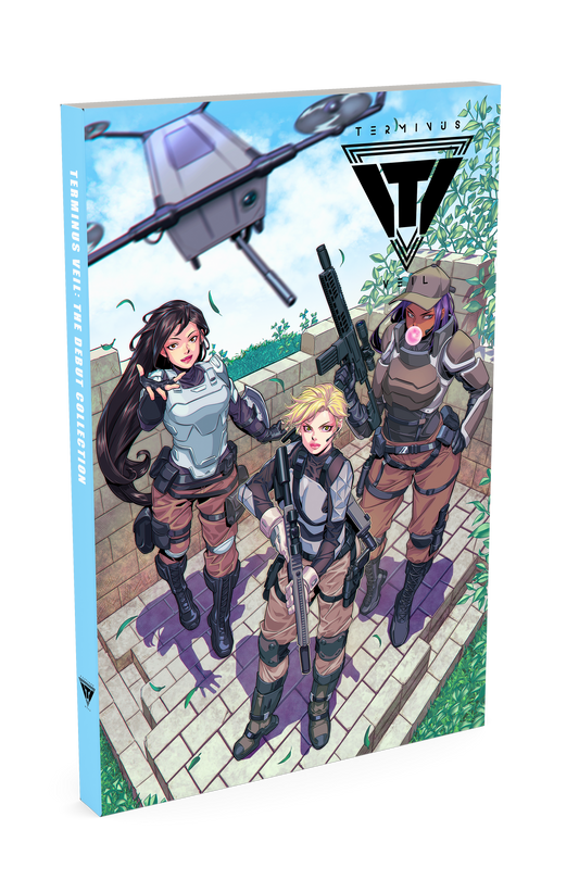 Terminus Veil Volume 1 is a trade paperback which includes issues 1 through 4. In addition, the trade features character biographies, background story details and concept artwork. That’s over 90 pages of sequential art and another 30 plus pages of complementary content. If you like the action of American style comic books like X-Men and Wildcats or the intricate high tech feel of mangas like Ghost In the Shell, this book is for you.